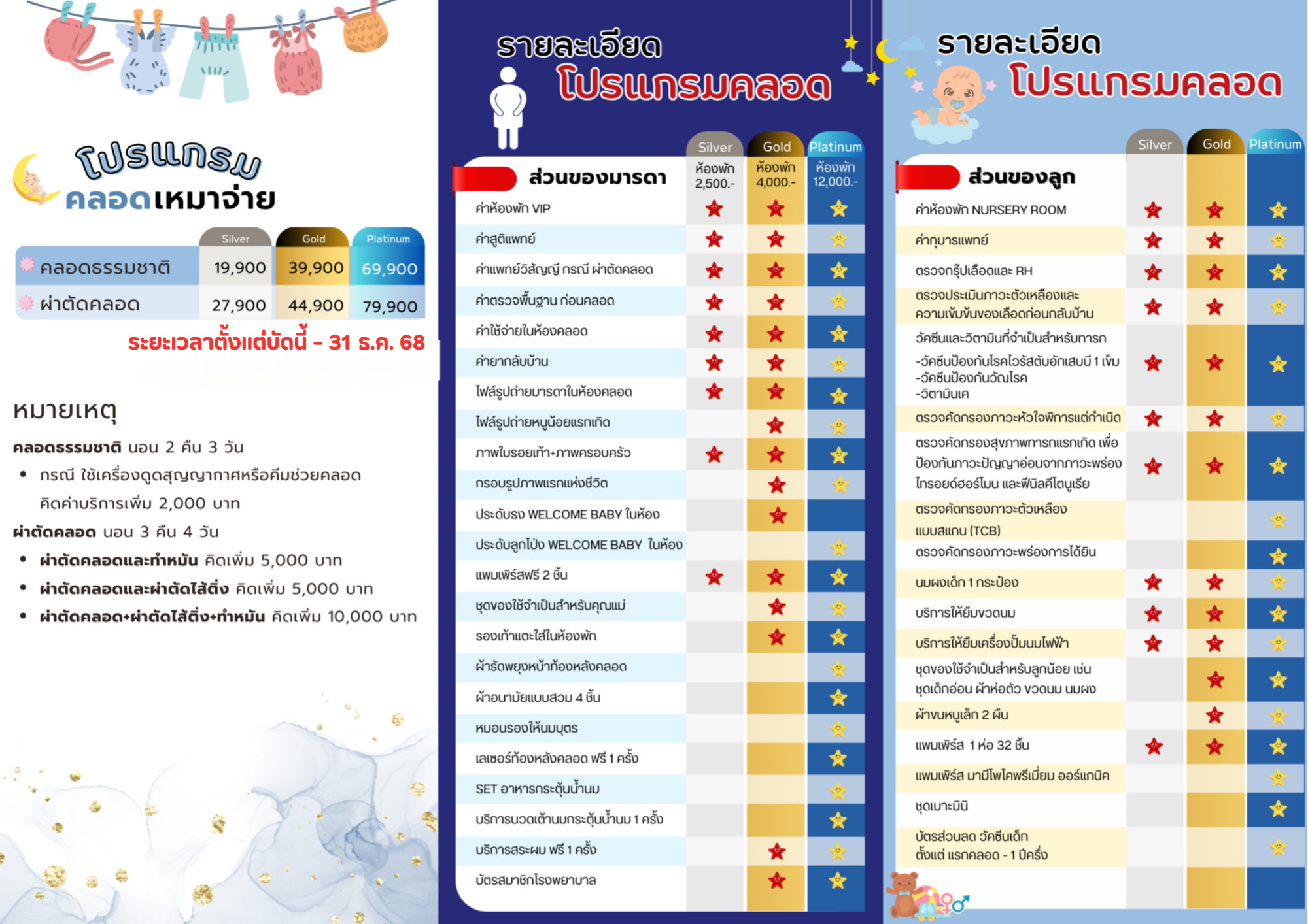 กรณี มีภาวะแทรกซ้อนเกิดขึ้นกับมารดาและทารก เช่น ภาวะตกเลือด ครรภ์เป็นพิษ หรือน้ำตาลในเลือดสูง/ต่ำ จะไม่รวมอยู่ในแพ็คเกจและคิดค่าใช้จ่ายในอัตราปกติ